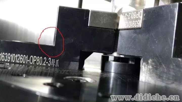 B:把卡盘夹紧力调小点试试,卡爪夹持工件后变形,向上张开了。卡爪刚性不足,薄弱处向箭头方向变形,把工件夹起来了。