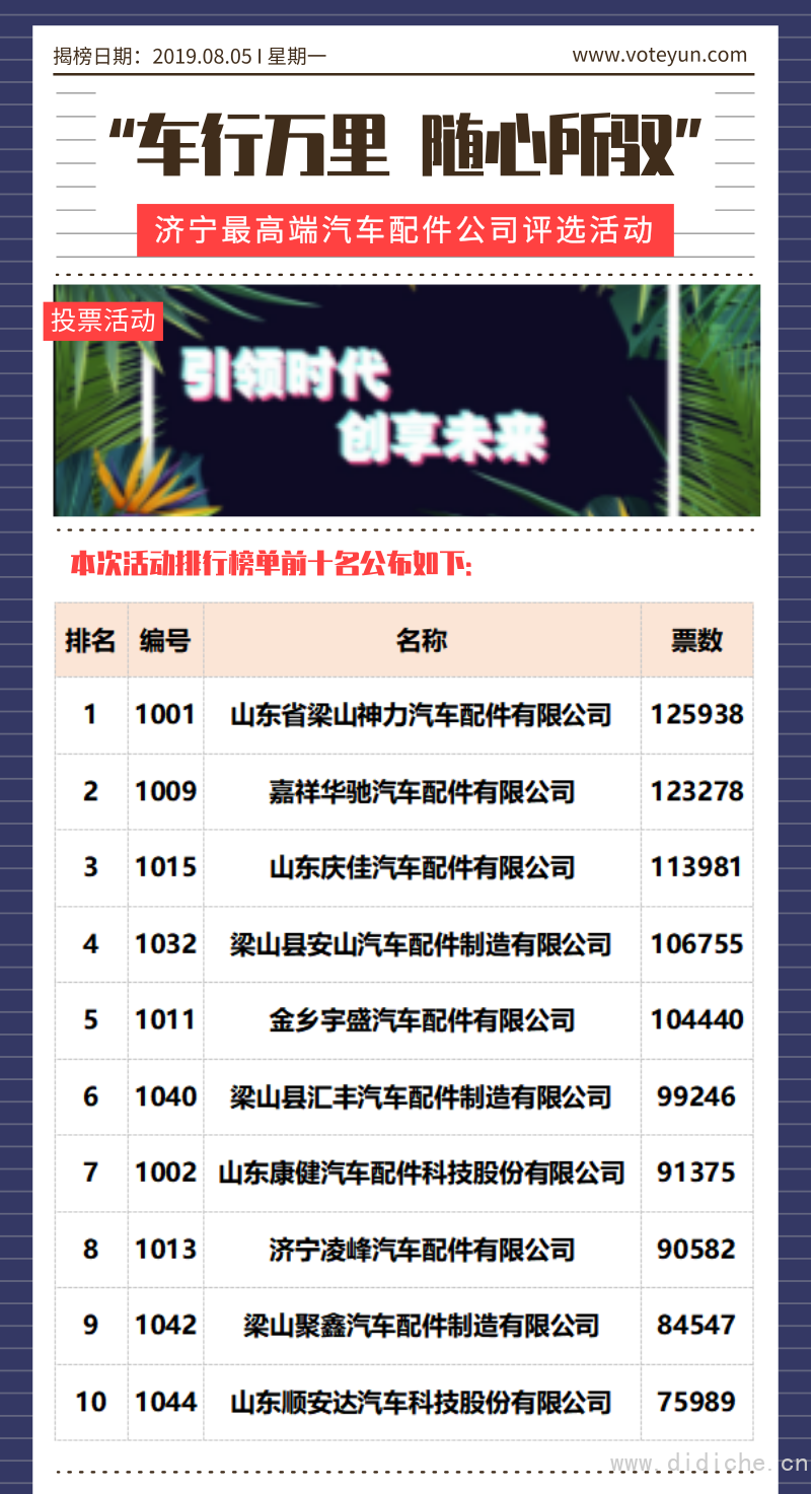 济宁市高端汽车零部件公司网络评选活动旨在促进全国汽车零部件行业健康健康发展,提高优质汽车零部件企业品牌知名度,促进行业服务技能的提高。尝试。提升汽配公司的品牌价值,通过更加直观的方式让客户了解汽配公司的水平,帮助客户选择合适的汽配公司,让大家体验到最好的服务,让客户在选择汽配公司时更加理性和目标。【排名公布】“车行万里,随心所驭”济宁最高端汽车配件公司评选!
