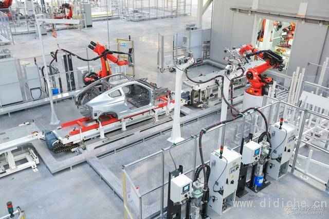 此次参观的焊装车间,一期共采用了75套KUKA机器人,焊接主线实现柔性生产,最多可适配4个平台;车顶采用激光焊接工艺及设备;白车身输送全部采用滚床滑撬形式。
