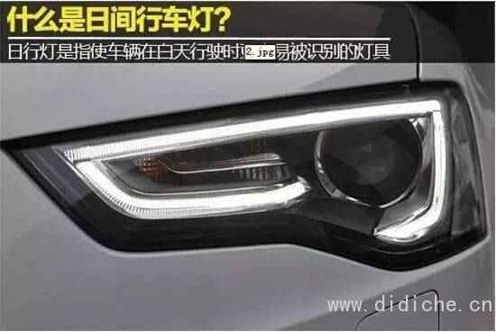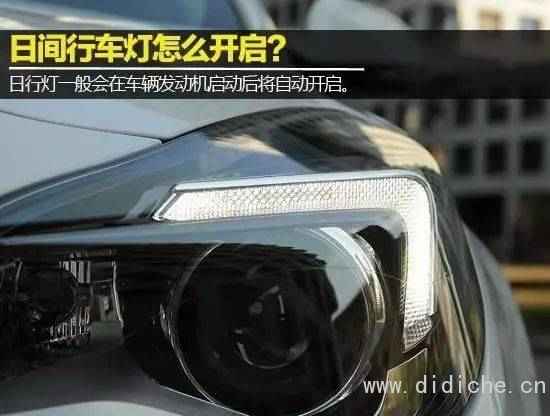 5、日间行车灯。装在车身前部,也就是说这个灯具不是照明灯,不是为了驾驶员能看清路面,而是为了让别人知道有一辆车开过来了,是属于信号灯的范畴。汽车发动机一启动,日间行车灯会自动开启,并不断增加亮度以引起路上其他机动车、非机动车以及行人的注意,当夜晚降临,驾驶者手动打开近光灯后,日间行车灯就会自动熄灭。
