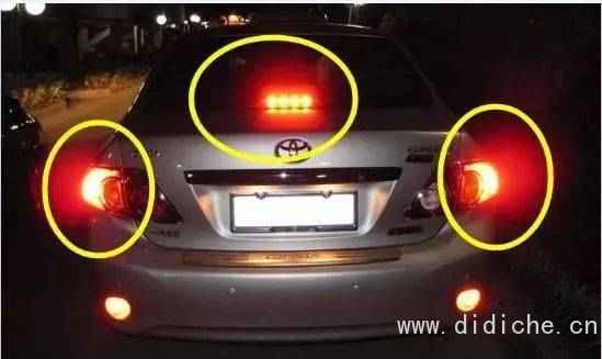 8、制动灯。制动灯就是刹车时亮起来的灯,制动灯总共有三处,分别是尾部刹车灯和左右侧以及高位制动灯。当驾车人踩下制动踏板时,制动灯亮起,并发出红色的光,提醒后面的车辆注意不要追尾。