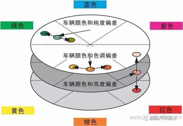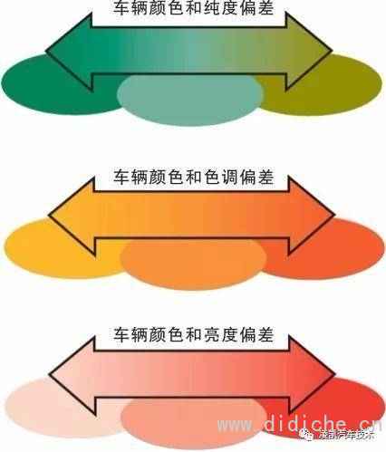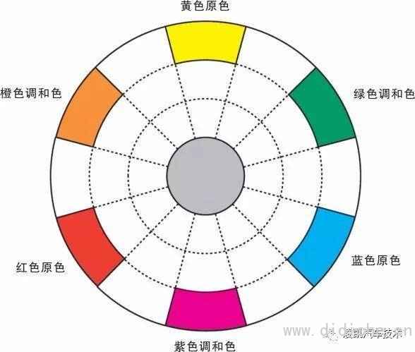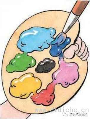 将颜色样板位于色素色环中,它与车辆油漆的位置相同。但是可以看出颜色的移动高出或低一个级别,即—种颜色过亮或过暗。