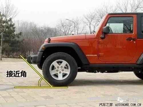 接近角是指在汽车满载(最大总质量)静止时,车辆前端的凸出点(特别是一些硬派越野车安置在车头处的绞盘也要算在其中)向前轮所引的切线与地面构成的夹角。