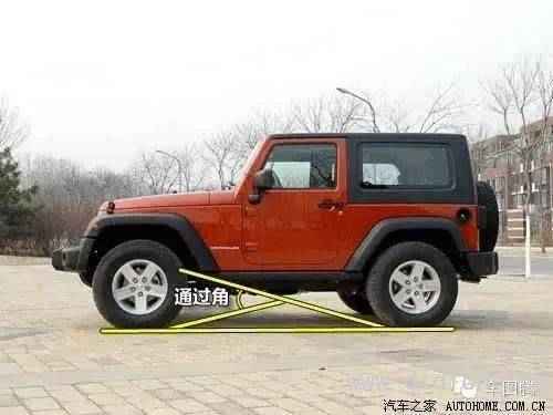 通过角是指车辆满载(最大总质量)静止时,分别通过前、后车轮外缘做切线交于车体下部最低部位所形成的夹角。以上三个数据都表征了车辆在上下坡或进行越野行驶时的通过能力,这些数值都是越大越好。