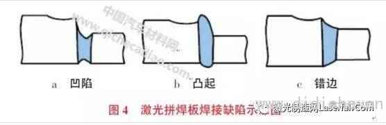 激光拼焊板焊接完成后易产生的质量缺陷,如图4所示。质量控制标准为:上下凹陷深度不得超过薄板厚度的10%;上下凸起不能超过薄板厚度的20%;上下错边深度不得超过薄板厚度的10%。
