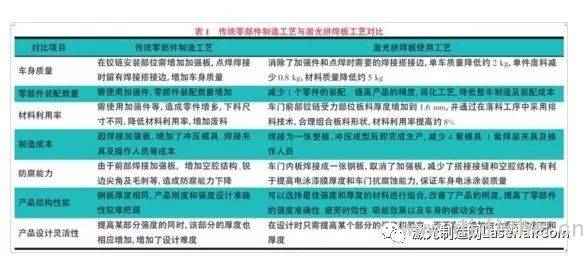 激光拼焊板在汽车产品上应用后,有效提高了整车的各项性能,并且在降低制造成本方面具有显著的优势。采用激光拼焊板与传统零部件产品制造工艺对比,其优势,如表1 所示。