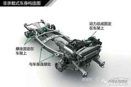 采用非承载式车身的汽车,其发动机、传动系统、车身的总成部分是固定在一个刚性车架上,车架通过前后悬挂装置与车轮相连。