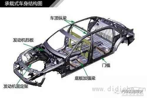 承载式车身汽车的整个车身是为一体的,没有贯穿整体的大梁,发动机、传动系统、前后悬挂等部件都装配到车身上,车身负载通过悬挂装置传给车轮。