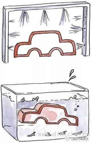 批量车身油漆工艺的第一步是对未油漆的车身进行清洁和去除油污。车身被浸在清洗槽中,然后喷射去污溶液。漂洗和干燥后,车身制造过程中的全部油污被清除了。