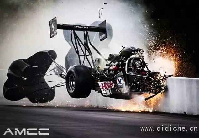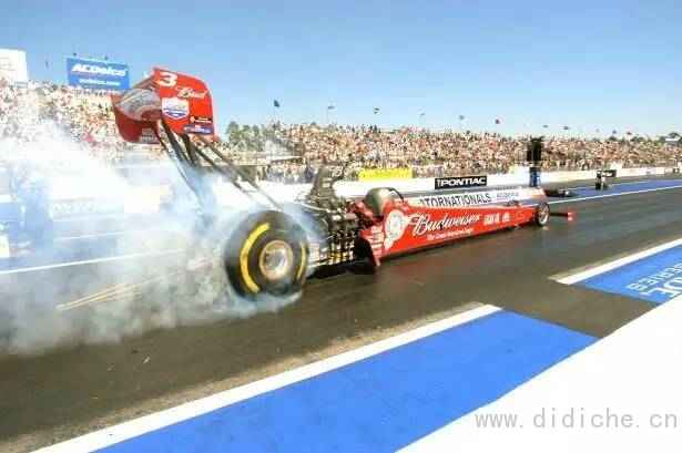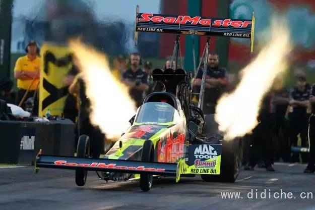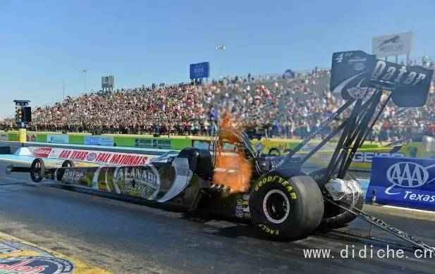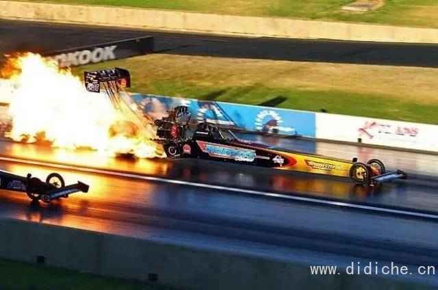 当然这都是自杀式的改装,再怎么强化都是徒劳。除了油耗巨大,可靠性也非常低,爆炸起火那是家常便饭。一个车队光是周末三天的比赛,就要准备好十台引擎备用。说到油耗,Top Fuel赛车使用的是硝基甲烷(nitromethane)燃料,单单跑一次就要烧掉56.8升。