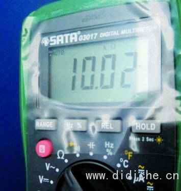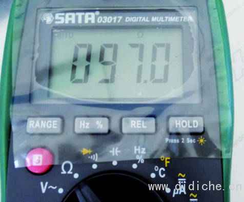 虽然是事故车辆,但变速器控制单元并不容易被撞坏,而且更换控制单元的风险更大一些,于是笔者决定先检测压力传感器。将2个压力传感器拆下来,查阅资料发现,传感器其实就是一个带线圈的电阻(压力开关),因此可以通过测量阻值来判断传感器是否正常。通过测量很快就发现了问题:一个压力传感器阻值为10.02Ω,在正常范围内(图5),而另一个压力传感器的阻值则为97.00Ω,完全不在规定范围内(图6)。