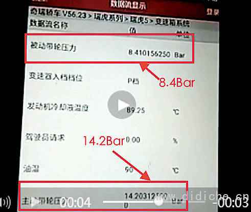 维修到此地步,不能再盲目更换任何部件了,万般无奈之下,笔者只能通过远程指导的方式来确定故障到底来自哪里。请对方维修技师在试车时连接故障诊断仪检测动态数据,重点观察输出带轮轴压力的变化,同时与输入带轮轴(主动)压力进行比较。最终通过视频对比发现,输出带轮轴压力明显低于输入带轮轴压力,而正常情况下应相差不大,如图4所示,主动带轮压力就是输入带轮轴压力,被动带轮压力就是故障码中的输出带轮轴压力。等到故障码出现时,数据则被冻结了。