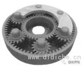 变速器是传统汽车和混合动力电动汽车动力传动系统的重要部件。变速器的性能对整车的动力性、经济性和 舒适性等有着重要的影响。由于新能源汽车直接或主要采用电动机驱动,其动力传动系统的关键部件—变速器结构相对于传统的燃油发动机汽车将发生重大的变化。由于电动机的低速扭矩大、工作转速范围宽的特点,原本在普通汽车上需要5 挡、6 挡的变速器,在电动车上只需要2 挡、1 挡,甚至倒车都不需要劳烦变速器帮忙,只需电动机反转即可。功能上的简化常导致结构的复杂。新能源汽车中,用于实现能量分流和综合的动力分配装置是一套行 星齿轮机构,其中行星架与发动机的输出轴相连,齿圈与电动机的转轴相连,同时也与输出齿轮相连,而太阳齿轮轴发出的动力驱动发电机发电,中间与离合器相连,动力切换时会将太阳轮锁死,使行星齿轮机构以一定的传动比工作。新能源汽车的变速器行星齿轮结构如图1 所示。