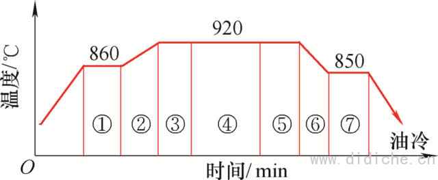 工艺阶段 温度/℃ 碳势Cp(质量分数)(%) 时间/min ① 860 1.15 0 ② 860 1.15 0.1 ③ 920 1.15 30 ④ 920 1.15 150 ⑤ 920 0.85 60 ⑥ 850 0.85 0.1 ⑦ 850 0.85 30