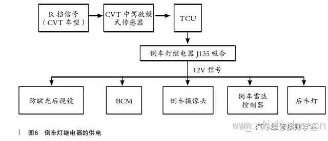 对自动挡车型,挂入R挡,TCU通过驾驶模式传感器的信号判断是R挡后,控制T48/M2管脚接地,吸合倒车灯继电器。倒车灯继电器吸合后,将12V电源信号发送到防眩光后视镜Z125、车身控制器U103、倒车摄像头Z52、倒车雷达控制器U106、后车灯Z186和Z187,如图6所示。