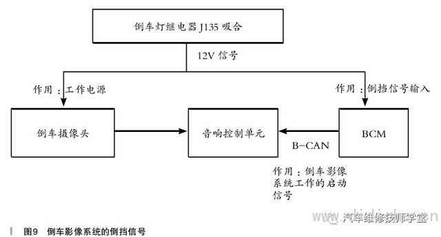 (2)BCM收到倒车继电器的倒挡信号后,通过B-CAN将倒挡信号传递给音响控制单元U115,此信号是倒车影像系统工作的启动信号,如图9所示。与倒车雷达系统相似,只有两路倒挡信号都正确时,音响控制单元才启动倒车影像系统工作。