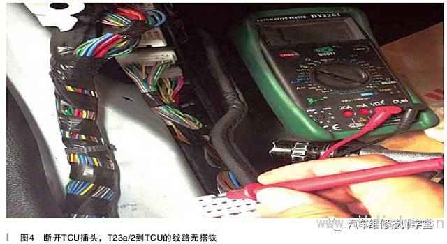 检查倒车灯继电器J135,发现继电器处在常吸合状态;拔下继电器后,倒车灯熄灭;检查倒车灯继电器,确认继电器正常;拔下继电器测量继电器供电端,正常,说明问题在继电器控制端;测量继电器的控制端2号端子到U107(TCU)的线路时,发现线路存在搭铁。断开中间连接插头T23a后测量TCU侧线束的2号针脚也存在搭铁;断开TCU控制单元插头,测量T23a/2端子到TCU之间的连接线路,无搭铁现象(如图4所示)。