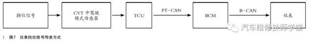 仪表挡位的信号是TCU通过PT-CAN(动力系统CAN通信线)将挡位信号传递给BCM,BCM将TCU的挡位信号通过B-CAN(车身系统CAN通信线)传递给仪表模块,如图7所示。