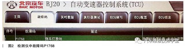 连接VDS诊断仪检测,TCU中有故障码:P1768倒车灯接地,如图2所示。