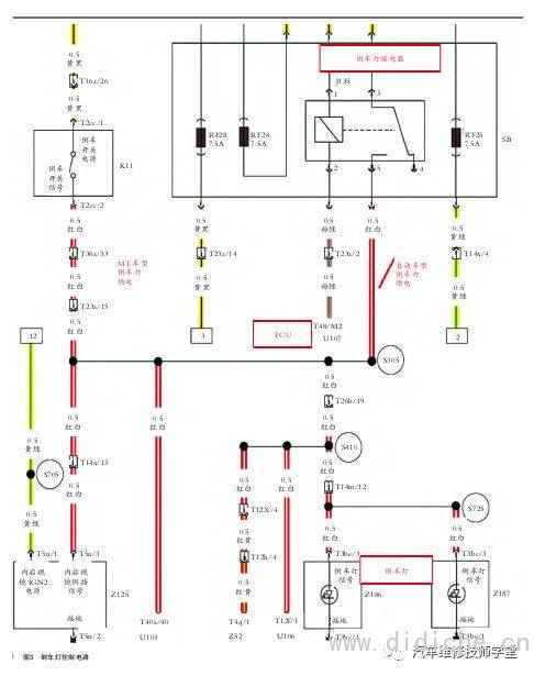 (1)倒车灯继电器J135输出到倒车雷达模块U106的线路,此线路的作用是作为倒车雷达控制器和倒车雷达探头的电源;