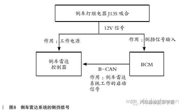 两路信号互为验证,只有当倒车雷达控制器收到的12V倒挡信号和B-CAN倒挡信号两路信号都正确时,倒车雷达系统才启动工作。