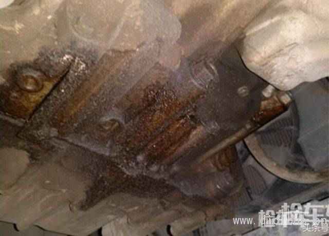 举升后检查底盘发现变速箱渗漏,根据油泥判断此现象已经有一段时间并且持续在漏油