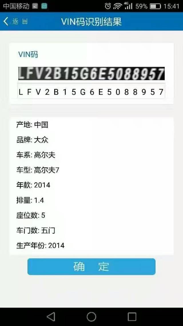 汽车Vin码识别与解析技术是通过安卓、IOS等移动前端处理来获取汽车Vin码,从而进行解析获得车辆信息,汽车Vin码识别与解析技术可以通过拍照、视频流等方式自动抓取汽车Vin码,并即可轻松解析车架号信息如:车辆产地、品牌、车系、车型、年款、排量、座位数、指导价格、车型代码、燃油类型、变速箱类型、发动机型号、发动机功率等等信息,非常简便!