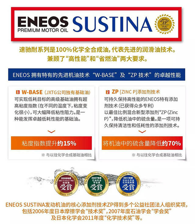 ENEOS引能仕旗下的SUSTINA速驰耐系列润滑油产品更是获得了全国车友的认可,SUSTINA速驰耐系列润滑油产品采用特有的先进基础油技术【W-base】及【ZP】添加剂技术的 100% 化学全合成油,兼顾了“高性能”和“省燃油”两大要求。拥有出众的发动机清洁分散性能,减少积炭与油泥的产生。节省燃油性能提高 2% 以上,发动机清洁性能持续力提高 2 倍,节省燃油性能的持续力提高 2 倍,达到了“性能”和“节能”的完美结合。
