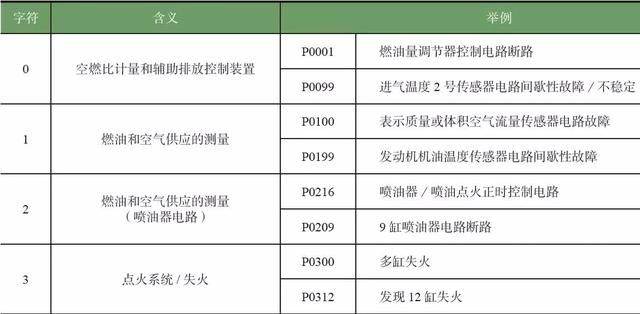 故障码中后两位字符表示触发故障码的条件,具体地表示了实际部件或特定的故障名称。故障码编号是从00~99,不同的传感器、执行器和电路分配了不同区段的数字编号。这些数字提供了比较具体的信息,如电压低或高、响应慢、信号超出范围等。