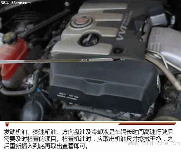 发动机油、变速箱油、方向盘油及冷却液是车辆长时间高速行驶后需要及时检查的项目。如果机油已经低于机油尺标注的最低刻度,应及时添加相同品牌、相同型号的机油。如机油的颜色已经不再清澈而变得乌黑浑浊,应马上更换,别忘了将机油滤清器一同更换。如果发动机有异常抖动、噪音变大、油耗增加或是加速无力等情况发生,应尽快对爱车的油路进行清洗,同时检查火花塞燃烧情况,如有异常也应及时更换。