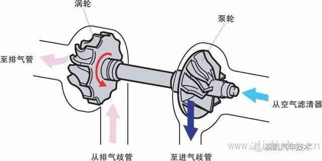 涡轮和泵轮安装在同一根轴上。来自排气歧管的废气压力使涡轮高速旋转,同轴上的泵轮跟着旋转,把进气压入气缸。