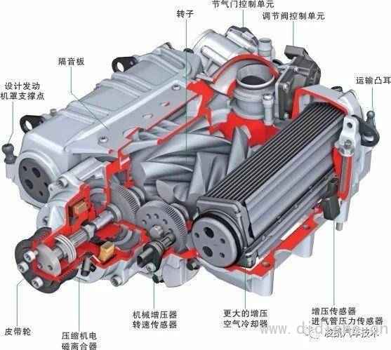 机械增压器本质上是一台罗茨鼓风机,有两个转子或三个,每个转子都扭转一定的角度,以形成一个螺旋。这两个或三个转子都由发动机曲轴通过皮带驱动,与废气系统不相干。