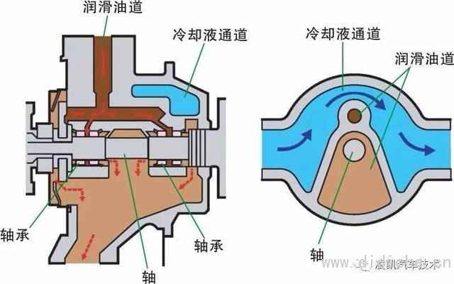 中间壳体通过轴支撑着涡轮和泵轮,中间壳体里有一个油道向轴和轴承提供润滑和冷却作用。另外,发动机冷却液循环流过中间壳体内的冷却液通道,防止机油温度升高及过早变质。