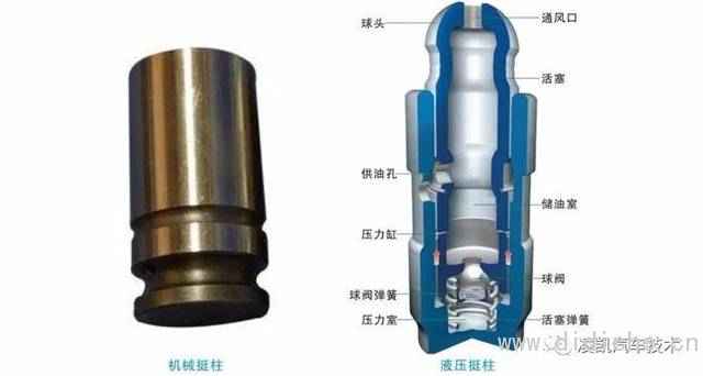 挺柱的作用是把凸轮传来的作用力传给推杆或气门。挺柱分为机械挺柱和液压挺柱。机械挺柱不能自动调整挺柱与凸轮的间隙,如果挺柱与凸轮的接触面严重磨损会导致气门间隙变大,产生异响,因此机械挺柱需要定期检查气门间隙。液压挺柱可以自动调整挺柱与凸轮的间隙,一般不需要检查气门间隙。