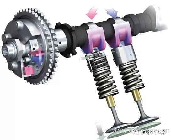凸轮轴上的凸轮与气缸中的气门相对应,发动机不同,气门的数量也有所不同。气门开闭时间取决于凸轮的形状,气门开闭时刻取决于凸轮轴的位置。