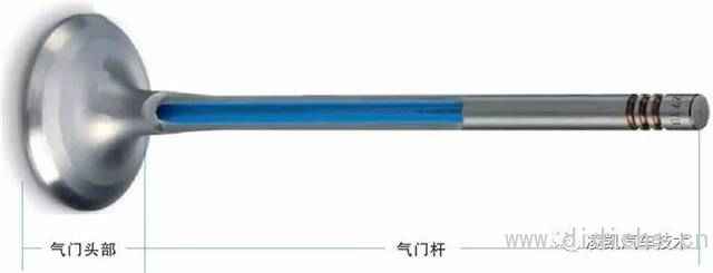 发动机的进、排气门分别是控制新鲜空气进入燃烧室和废气排出气缸的门户,由于其头部呈蘑菇形,故称为菌形气门。气门由气门头部和气门杆两部分构成。