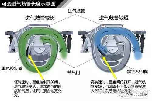 当发动机低速运转时,黑色控制阀关闭,气流被迫从长歧管流入气缸,可以增加进气的气流速度和压强,使汽油和空气更好的混合,燃烧更充分(这个有点像把水流不急的水管捏扁后,水流速度会变急的原理一样)。当发动机转速升高时,控制阀门打开,气流绕开下端管道直接进入气缸,这时能更快吸入更多的空气,增大发动机高转速的进气量。