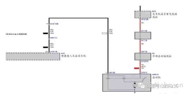 查阅电路图(如图所示),启机是由CAS(便捷进入及启动控制模块)控制,那么这3个信号一定要真实有效地传递到CAS里面,它才会控制启动机运转。灯光能够正常打开,制动灯也能够点亮,说明这两个信号CAS已经接收到。