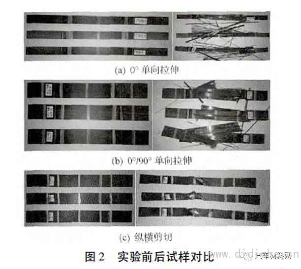 为了选择汽车底盘碳纤维后纵臂材料,并为后续的设计提供所需的力学性能参数,分别对不同碳纤维编织布和单向带增强的复合材料进行单向拉伸、三点弯曲和纵横剪切实验,获得相应的拉伸、弯曲与剪切性能参数。