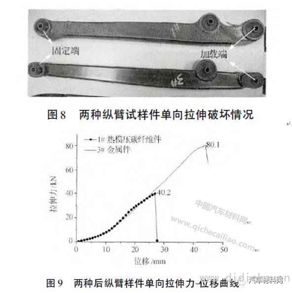 图9 给出了两种试样的拉伸力-位移曲线。由图可见,1#碳纤维件的整体刚度和3#金属后纵臂的刚度相当,满足初步设计要求; 而1#碳纤维件的极限抗拉强度只有3 #金属件的一半。