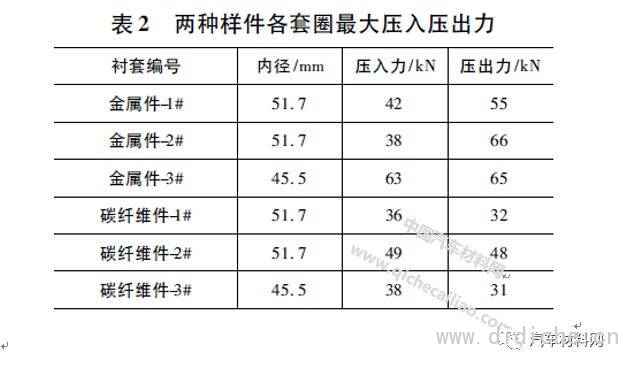 在后纵臂压装实验中,金属和碳纤维两种样件的压入压出力见表2,对比后纵臂压装实验要求,可知上述样件均满足压装要求。