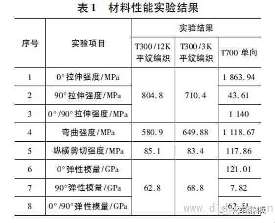 表1 列出了实验测得不同材料的主要性能参数。由表1 可以看出,小丝束的T300 /3K 平纹编织布复合材料比大丝束的T300 /12K 的弹性模量要高,这是由于小丝束碳纤维编织布由于编织带来的微弯曲较小,但强度主要取决于碳纤维的强度,故二者强度值相近。