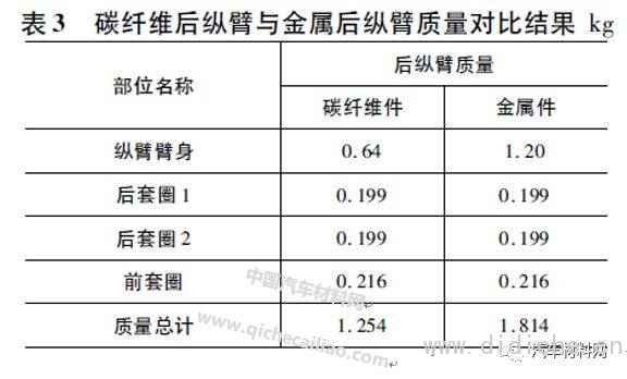 碳纤维后纵臂在固定端处金属套圈未发生塑性变形,说明传力路径不通畅,有局部应力集中,导致碳纤维纵臂整体有效承载能力不足。在下一步的研发过程中,将进一步优化复合材料后纵臂结构设计,使碳纤维后纵臂结构更加合理,整体变形均匀,有效承载能力提高。碳纤维纵臂与金属纵臂质量对比结果见表3。