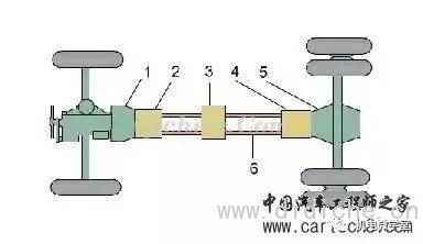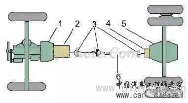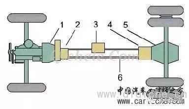 1-液力变矩器 2-自动器变速器 3-万向传动 4-驱动桥 5-主减速器6-传动轴