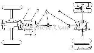 1-离合器 2-油泵 3-控制阀 4-液压马达 5-驱动桥 6-油管