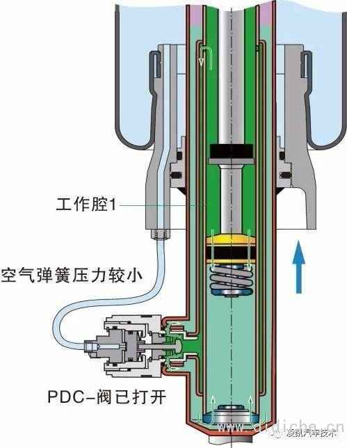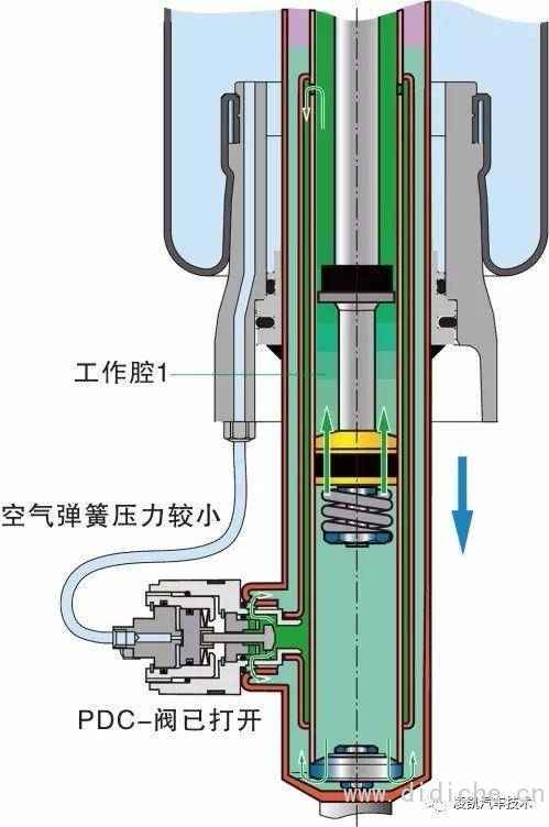 由于控制压力(空气弹簧压力)及液体流过PDC阀的阻力变小了,因而减振力(阻尼力)就减小了。