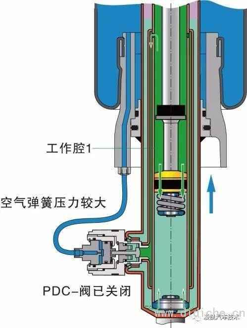 由于控制压力(空气弹簧压力)及液体流过PDC阀的阻力增大了。大部分液体(取决于控制压力)必须流过底阀,因而减振力(阻尼力)就增大了。