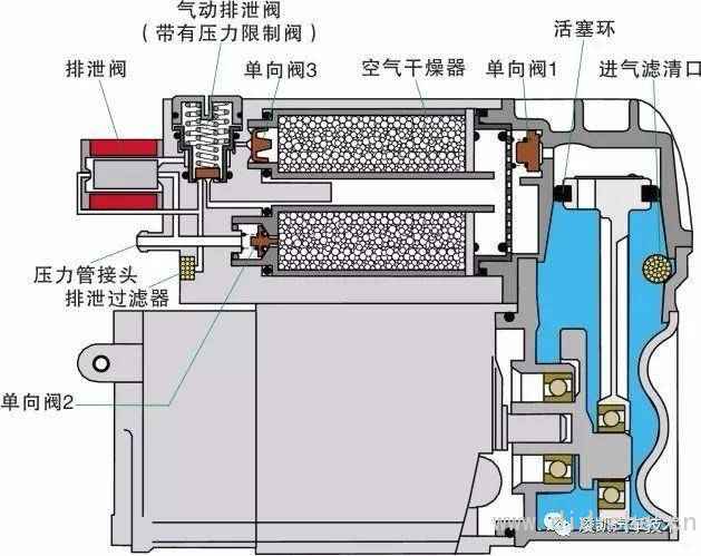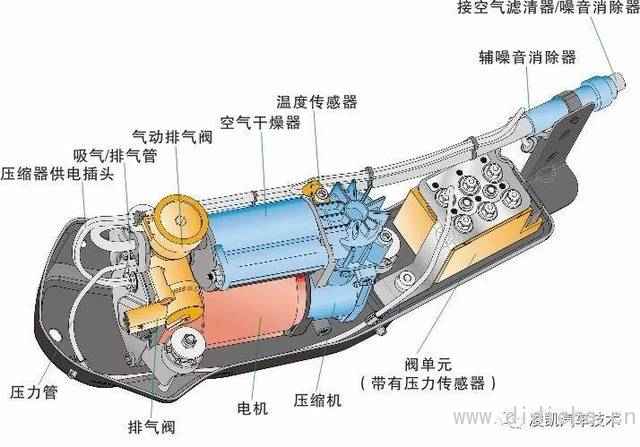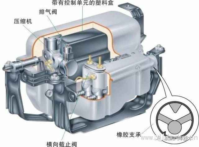 空气供给系统安装在车外备胎坑前部,由电动机、压缩机、电磁阀单元、温度传感器、空气干燥器、气动排气阀等组成。压缩空气是由一个单级往复活塞式压缩机产生的。为了避免压缩空气产生冷凝水引起部件锈蚀必须采用空气干燥器给压缩空气去湿。气动排气阀的作用是保持系统剩余压力和限压。为了提高系统工作的可靠性,在压缩机的缸盖上安装有温度传感器,悬架控制单元要根据压缩机的运行时间和温度信号计算出压缩机的最高允许温度,并在超过某个界限值时关闭压缩机或不让压缩机接通,避免压缩机过热。