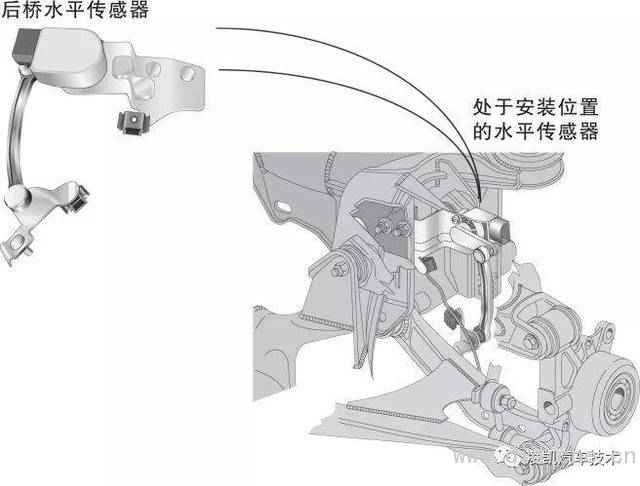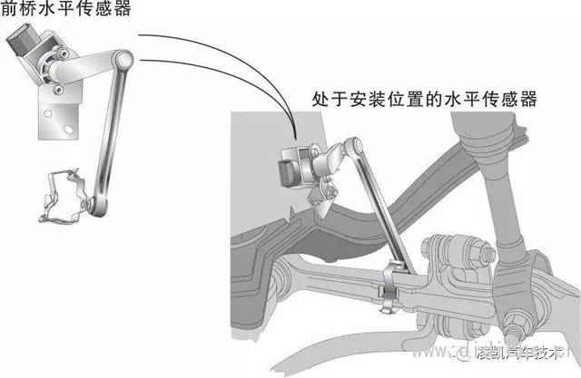 转向角类水平传感器,借助一个连杆机构可将车身水平变化转换为角度变化,为非接触式传感器,利用感应原理。
