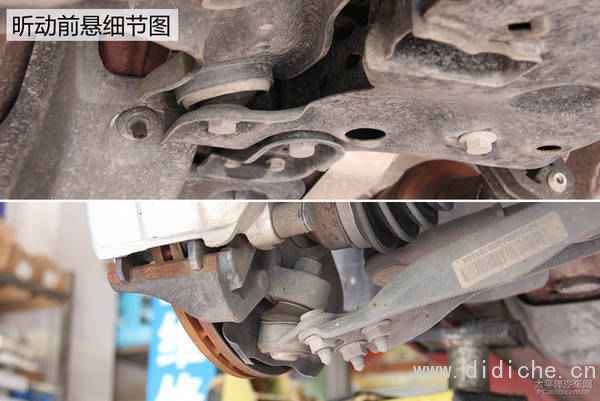 下摆臂与副车架的连接处采用了橡胶圈连接,但副车架与车身的连接则没有使用橡胶垫,使得悬架传递到副车架的震动直接传递到车身。下摆臂和转向拉杆与轴承座之间的连接则采用带防尘套的鱼眼螺栓。